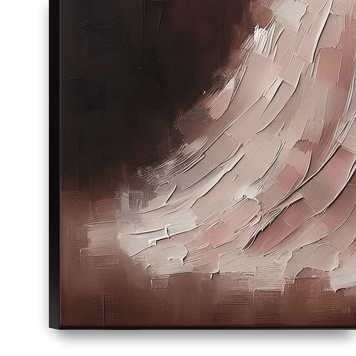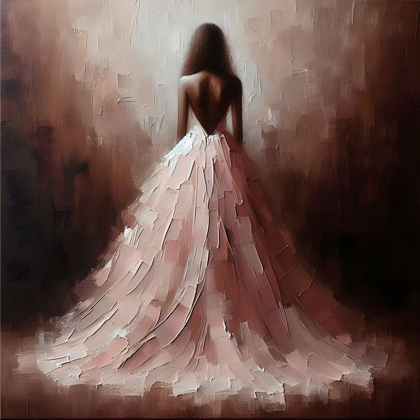 Abstraktes Ölgemälde, ausdrucksstarke Pinselstriche und dicke Farbtextur (Impasto), Erdtöne wie Ocker, Siena und warmes Braun. Eine weibliche Figur im Zentrum des Bildes, teilweise abstrakt wiedergegeben, gekleidet in ein langes blassrosa Kleid, das subtil mit dem erdigen Hintergrund kontrastiert. Minimalistische Formen, emotionale…