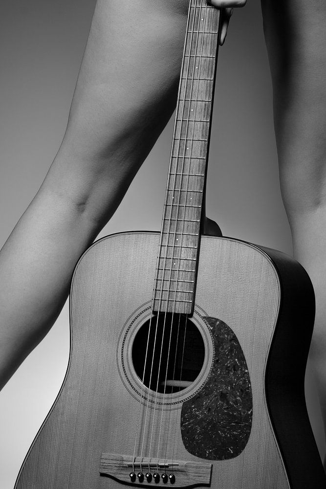 Eine schöne Frau posiert gewagt in ihren Dessous und High Heels mit einer akustischen Westerngitarre. Eingefangen von einem schönen Lichtstrahl im Fotostudio. Schöne Kurven der Frau in Kombination mit musikalischen Gedanken durch die Kamera eingefangen