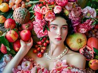Eine Frau in einem geblümten Kleid posiert neben einer farbenfrohen Obstauslage. Das Porträt betont Farbe, Textur und natürliche Eleganz in einer harmonischen Komposition.