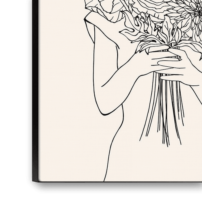 Einen Moment subtiler Anziehung einfangend, stellt diese Linienzeichnung eine Frau dar, die einen Blumenstrauß in den Händen hält, ihr Gesicht von ihm verhüllt. Sie lädt die Betrachter ein, über die Emotionen nachzudenken, die sich hinter den zarten Blüten verbergen