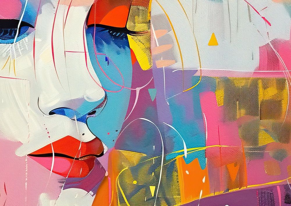 Frau mit Farben | Bunte Frau - Auf diesem abstrakten Gemälde sehen Sie eine Frau mit einem farbenfrohen Gesicht, mit auffälligen Farbtönen wie Rosa und Blau und Details wie einem kräftigen Lippenstift und lebensechten Augen, die das Bild lebendig machen.