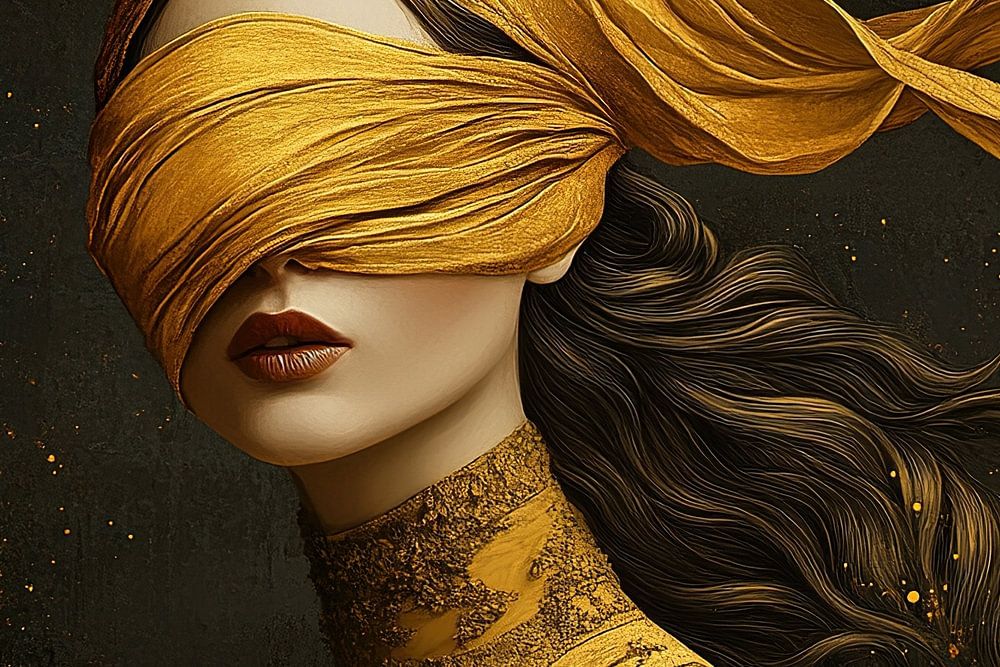 Frau mit Gold - Dieses Frauenbild zeigt eine Frau mit einem gelben Tuch um den Kopf, während ihr langes Haar frei fällt und der Hintergrund dunkel mit goldenen Highlights ist.