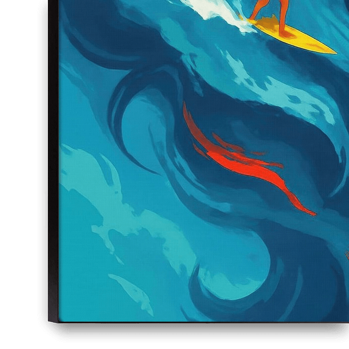 Ein auffälliges Porträt füllt das Bild, wobei das Haar zu kraftvollen Meereswellen geformt ist, in denen drei Surfer ihre Linie wählen. Helle Blautöne und schäumendes Weiß kontrastieren mit warmen Akzenten um Lippen und Wangen und schaffen so Tiefe und Fokus. Anmutige Locken suggerieren Bewegung, während strenge Gesichtszüge für Ruhe…