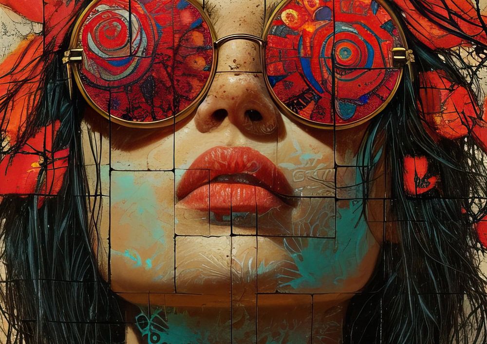 Details: Frau, Portrait, Blumen, modern, Kunst, rot, schwarz, blau, orange, gold