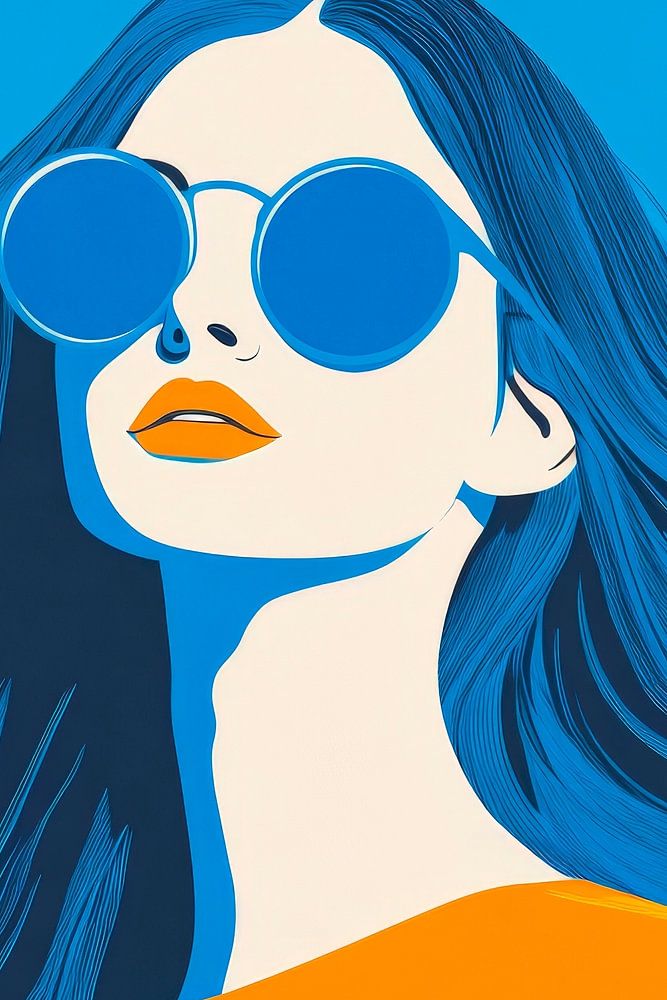 Ein lebendiges Porträt, das die Leichtigkeit des Sommers in leuchtenden Blau- und Orangetönen einfängt. Die fließenden Haare und die stylischen Sonnenbrille strahlen Selbstbewusstsein und Freiheit aus. Perfekt für das Wohnzimmer, wo es einen Hauch von Frische und Lebensfreude verleiht. Ideal, um die Atmosphäre aufzuhellen und Gespräche zu inspirieren.