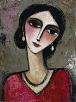 Frau mit großen Augen – Auf diesem Frauenbild sehen Sie eine Frau mit einem auffälligen roten Kleid und einem Ohrring. Ihr Gesicht hat eine einzigartige Form mit großen Augen und heller Haut, was ihr ein interessantes Aussehen verleiht.