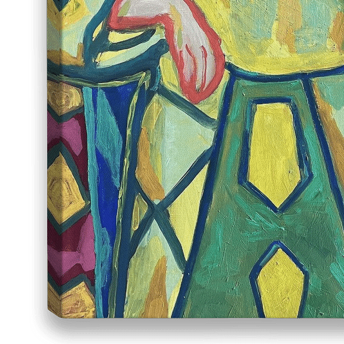 Ein farbenfrohes figuratives Werk für einen modernen Stil in der Wohnung oder einfach als Kontrapunkt zu den Klassikern. Das Originalwerk ist mit Ölfarbe gemalt.
