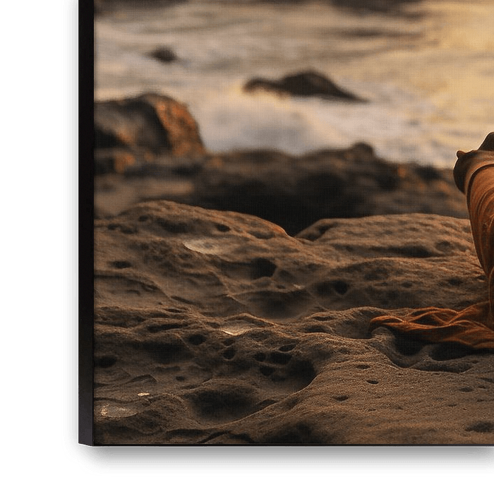 Frau sitzt bei Sonnenuntergang am Strand