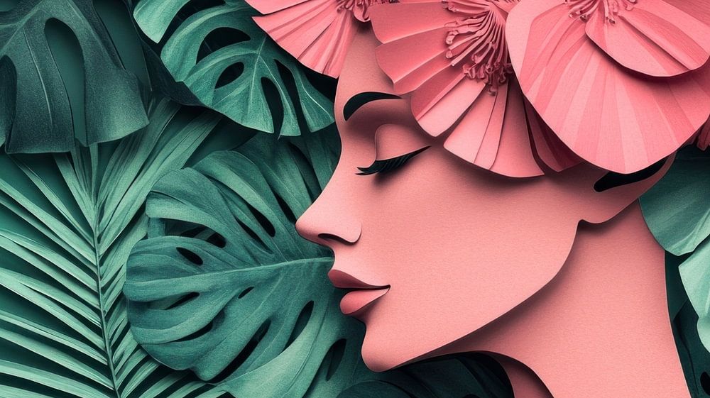Das Haar der Frau ist eine üppige Komposition aus tropischen Elementen. Leuchtend rosafarbene Papierblumen, möglicherweise Hibiskus oder Orchideen, sind mit grünen Palmenblättern verwoben, die alle sorgfältig geschnitten und geschichtet wurden, um Tiefe und Textur zu erzeugen. Diese Blumen formen nicht nur ihre Frisur, sondern scheinen sich auch in den Hintergrund auszubreiten und die Grenze zwischen Figur und Umgebung zu verwischen.