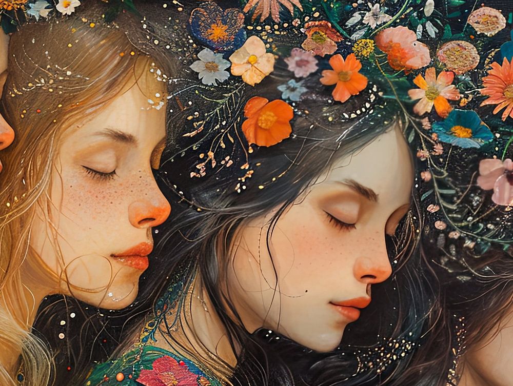Frauen zusammen mit Augen geschlossen in malerischen Stil mit Blumen und Sternen in romantisches Bild