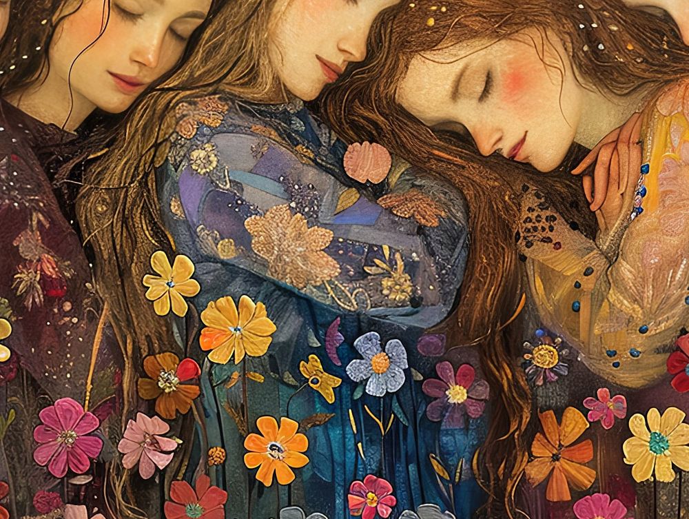 Frauen zusammen mit Augen geschlossen in malerischen Stil mit Blumen und Sternen in romantisches Bild