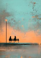 Frauenbank | Woman Bench – Dieses Frauenbild zeigt zwei Silhouetten von Frauen auf einer Bank neben einer einsamen Laterne in einer warmen, modernen, abstrakten Landschaft mit großen türkisfarbenen und orangefarbenen Flächen, einer luftigen, abstrakten Bildatmosphäre und eignet sich perfekt als Frauenbild oder Bild mit Frauen für alle,…