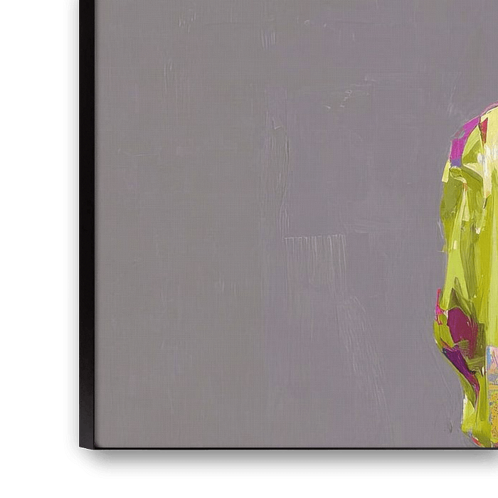 Woman Dress | The Dazzling Dress and Face - Dieses moderne Kunstgemälde zeigt eine Frau mit einem glänzenden, facettierten Gesicht in einem auffälligen gelben Kleid mit bunten Blumenmustern vor einem weichen grauen Hintergrund.