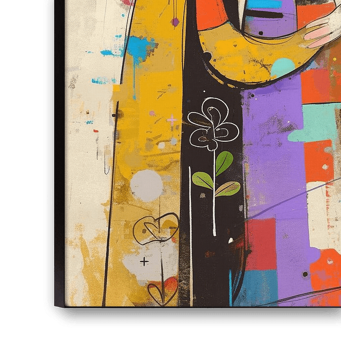 Women's Painting | Whispers of Colour - Dieses farbenfrohe und ausdrucksstarke Gemälde zeigt zwei stilisierte weibliche Figuren, die sich innig umschlungen auf die Wange küssen. Sie tragen farbenfrohe, abstrakte Kleidung und sind von verspielten Symbolen und Texturen umgeben, die einen warmen und liebevollen Eindruck vermitteln.