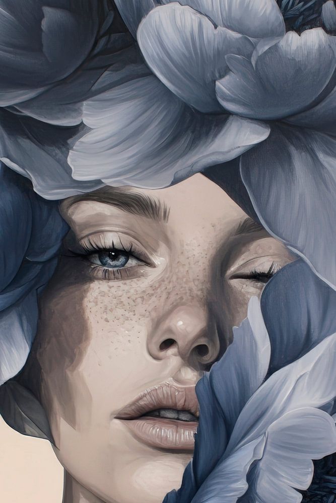 Ein traumhaftes Zusammenspiel aus sanften Grau- und Blautönen entfaltet sich, während eine anmutige Figur von üppigen Blumen umrahmt wird. Die melancholische Ausstrahlung und die detailreiche Gestaltung der Blüten verleihen jedem Raum eine elegante Note. Diese Kunst ist perfekt für ein Schlafzimmer, wo sie eine ruhige, verträumte Atmosphäre schafft.