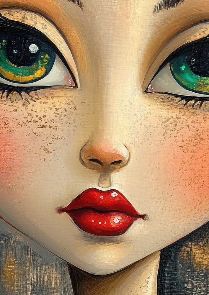 Frauenporträt mit großen Augen - Dieses Frauengemälde zeigt ein Mädchen mit großen grünen Augen, roten Lippen und einem auffälligen goldenen Haargummi, die zusammen dem Porträt einen verspielten und modernen Look verleihen.