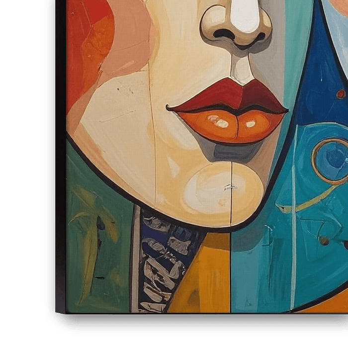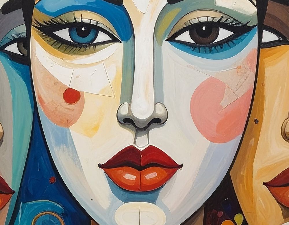Eine Komposition im malerischen und grafischen Stil von drei weiblichen Gesichtern, die gleichzeitig einzigartig und fast verschmolzen erscheinen. Dieselben Gesichtszüge, dieselben verträumten Ausdrücke, dasselbe Aussehen und doch so komplementär, so nah, als ob diese Dreifaltigkeit die zugrunde liegende Einheit enthüllt. Das einzige Detail, das sie voneinander unterscheiden könnte, ist die Augenfarbe der Figuren. Die zentrale Figur hat ein blaues und ein braunes Auge, und auch hier wird man feststellen können, dass es sich um eine Verbindung der Augen der beiden anderen handelt. Eine Form der Synthese, die durch das zentrale Gesicht veranschaulicht wird.