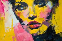 Dieses eindrucksvolle Frauenporträt besticht durch seine lebhaften Farben und expressiven Pinselstriche. Die kräftigen Gelb-, Pink- und Schwarztöne erzeugen einen starken visuellen Kontrast und verleihen dem Bild eine kraftvolle Ausstrahlung. Der intensive Blick der Frau zieht den Betrachter in ihren Bann und bringt eine dynamische…