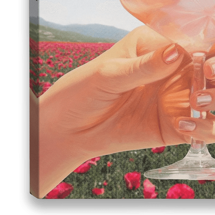 Holen Sie sich die verspielte Szenerie des Mohnfeldes in Ihr Zuhause mit dieser Collage, die ein Pin-up-Girl in einem Cocktailglas vor einem roten Mohnfeld zeigt. Holen Sie sich sofortige Frühlingsgefühle!