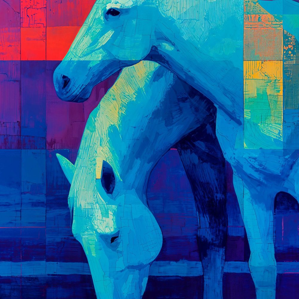 Ein lebendiges, abstraktes Gemälde mit zwei Pferden, die an einer Wasserfläche stehen; die Szene setzt sich aus geometrischen Farbflächen zusammen. Die allgemeine Atmosphäre ist ruhig und mystisch, eine Kombination aus Realismus und abstraktem Expressionismus.