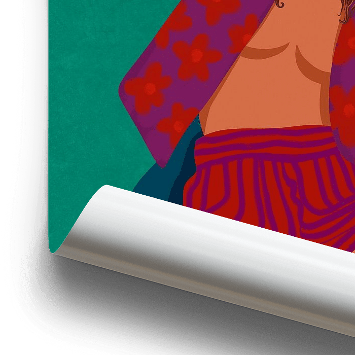 Moderne und farbenfrohe Illustration einer Frau in stilvoller, gemusterten Kleidung, die eine Blume raucht.