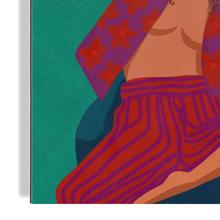 Moderne und farbenfrohe Illustration einer Frau in stilvoller, gemusterten Kleidung, die eine Blume raucht.
