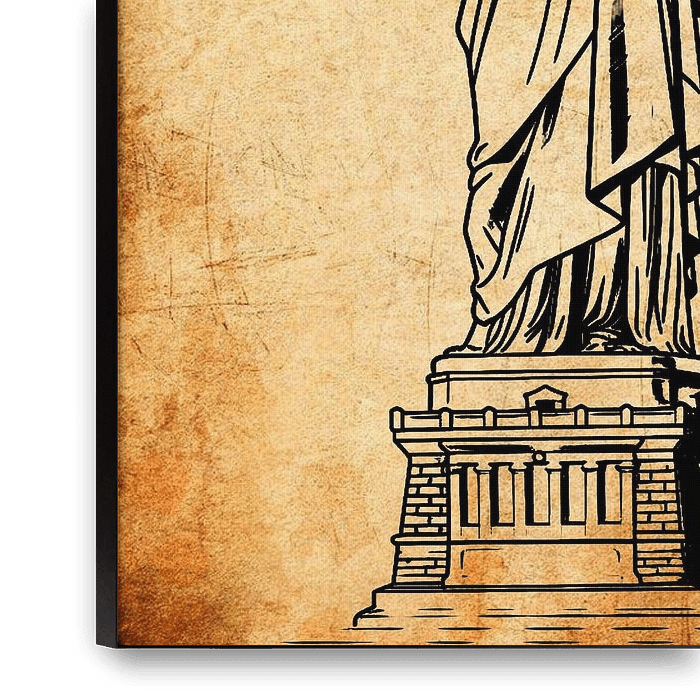 Das Bild zeigt eine Schwarz-Weiß-Illustration der Freiheitsstatue, die in einem Vintage-Stil gehalten ist. Die Statue ist im Profil dargestellt und hält eine Fackel in ihrer rechten und eine Tafel in ihrer linken Hand. Sie trägt ein wallendes Gewand und eine Krone mit strahlenden Spitzen. Der Hintergrund besteht aus einer…