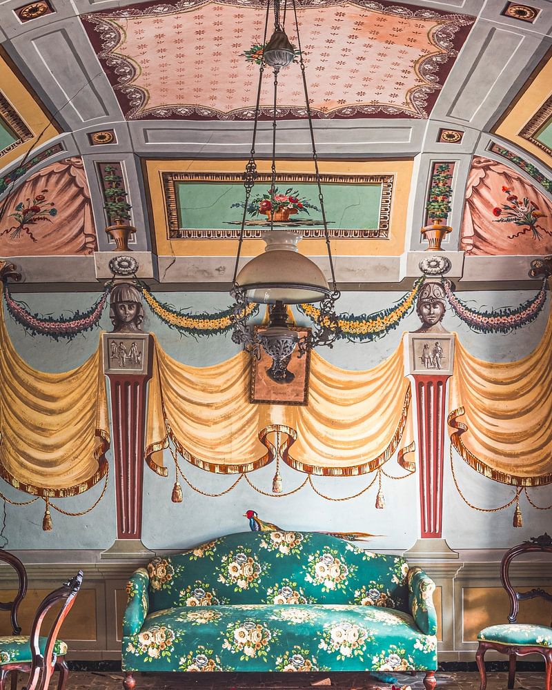 Ich habe dieses Zimmer im ersten Stock einer verlassenen italienischen Villa fotografiert. Der gesamte Raum ist mit diesem wunderschönen Gemälde bedeckt, das noch weitgehend intakt ist. Das Zimmer wurde anscheinend noch nicht von Vandalen angegriffen, während der Rest der Villa ein völliges Chaos ist. Die Villa steht schon seit einiger Zeit leer und es gibt keine Pläne, das Anwesen zu verkaufen oder zu renovieren.