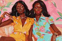 "Freunde", buntes Porträt, Mode. Zwei junge Frauen in bunten Kleidern sitzen vor einem ebenso bunten Hintergrund. Ein außergewöhnliches Werk und ein absoluter Blickfang für Ihr Interieur!