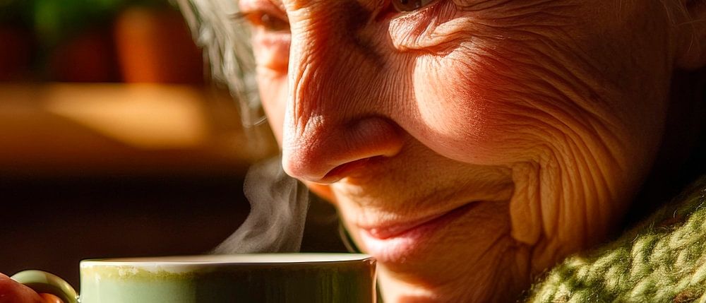 Im warmen Licht des Morgens strahlt eine ältere Dame Freude und Zufriedenheit aus. Mit einer Tasse dampfendem Tee in der Hand und einem gemütlichen Schal um den Hals versprüht sie Geborgenheit. Dieses Bild lädt zu entspannenden Momenten ein und passt perfekt in jede einladende Küche oder nostalgiereiche Leseecke, wo Geschichten lebendig werden.
