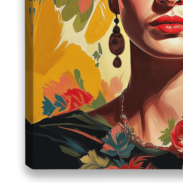 Frida in Rosen im Haar. Sehr farbenfroh, bunt.
