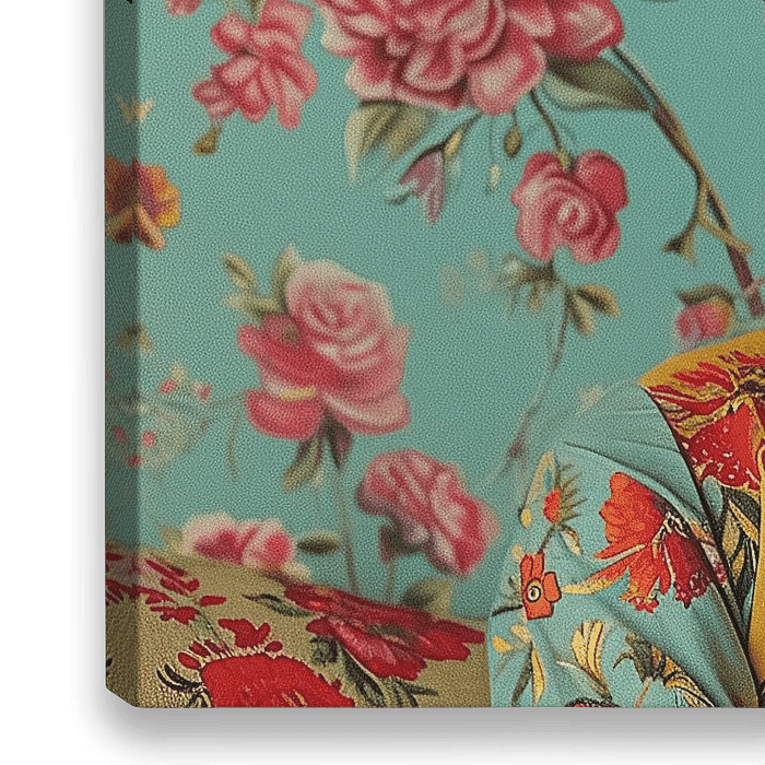 Ein schönes Porträt von Frida, mit einem Hintergrund voller Rosen und Pfingstrosen in Türkis mit rosa Blumenmuster. Sie trägt Blumen auf dem Kopf, einen Ohrring, der dem Dior-Logo ähnelt, und goldene Ketten um ihren Hals. Ihr Gesicht sieht aus wie aus Stein, und sie trägt leuchtend roten Lippenstift.