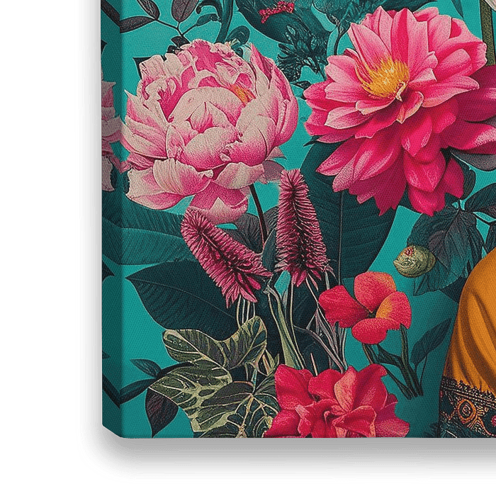 Frida Porträt im Stil von türkis und rosa floral gemusterten Hintergrund, sitzt auf einem Sessel mit Blumen im Haar, trägt einen türkisfarbenen Blazer und gelbe Bluse.