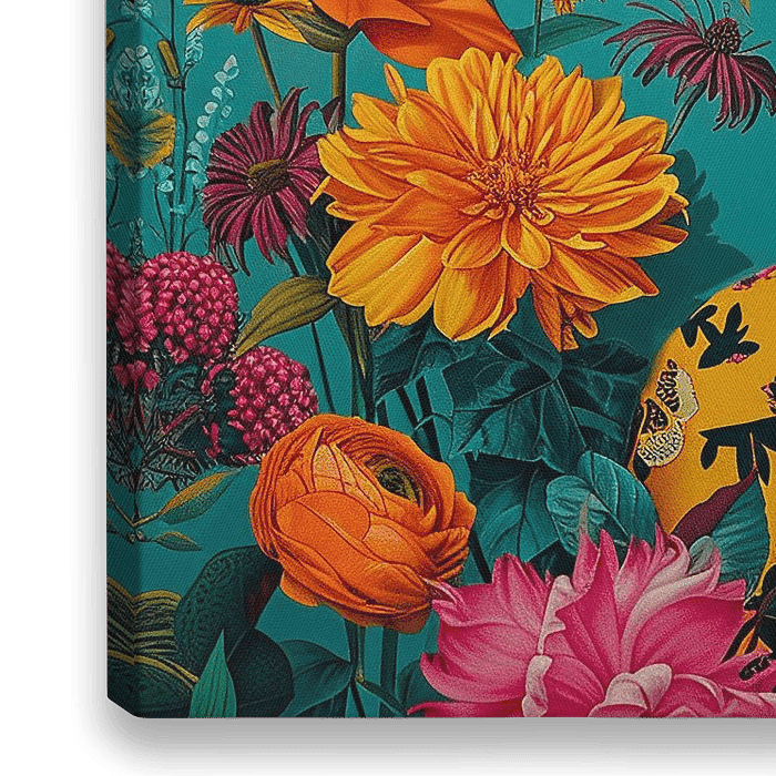 Ein Porträt von Frida mit ihrem ikonischen Blumenkopfschmuck und farbenfrohem Outfit. Der Hintergrund ist ein lebhafter Wandteppich aus Blumen in Rosa-, Gelb- und Türkistönen im Stil von Kahlo.