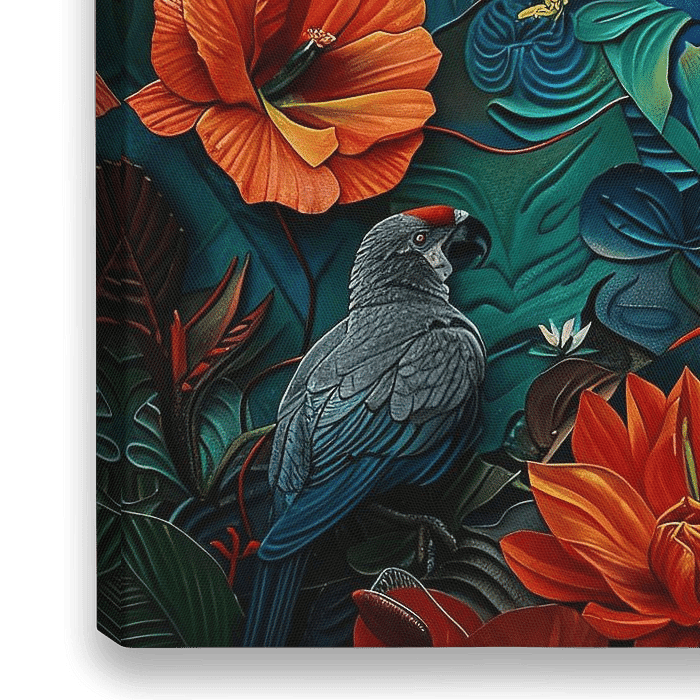 Ein lebendiges und ausdrucksstarkes Ölgemälde zeigt Frida, umringt von exotischen Vögeln, blühenden Blumen und einer üppigen Landschaft. Die Farbpalette sollte reichhaltig sein, mit lebendigen Blau-, Rot-, Grün- und Gelbtönen, um die Schönheit im einzigartigen Stil von Frida einzufangen.