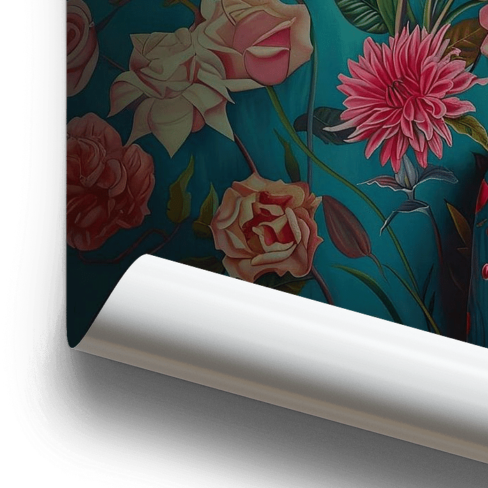 Ein Porträt von Frida im Stil eines Ölgemäldes, mit Blumen auf dem Kopf und einem blauen Blumenkleid mit rosa Rosen und gelben Pfingstrosen im Hintergrund, mit leuchtend türkisfarbener Tapete.