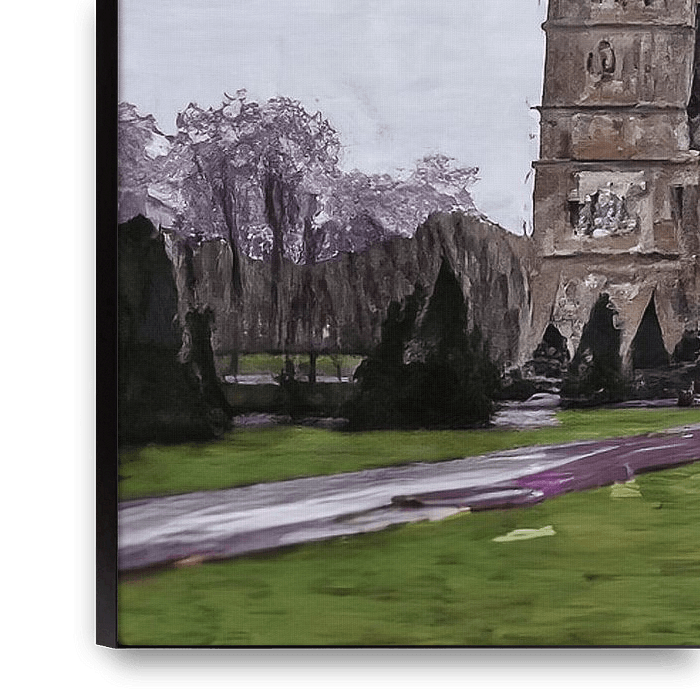 Einzigartiges digitales Gemälde des Friedenspalastes in Den Haag, ideal als Wanddekoration. Hergestellt aus einem echten Foto, perfekt für ein beeindruckendes Kunstwerk an der Wand.