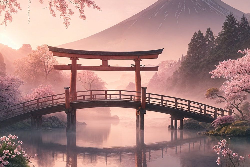 Dieses bezaubernde Bild fängt eine Szene voller Ruhe und Schönheit ein. Es zeigt eine traditionelle rote Torii, die sich über einen ruhigen Teich erstreckt, umrahmt von blühenden Kirschbäumen in zartem Rosa. Der Berg Fuji erhebt sich majestätisch im Hintergrund, umgeben von einem pastellfarbenen Himmel, der die ersten Strahlen der Morgensonne einfängt. Die Szene ist getaucht in ein weiches, warmes Licht, das die Stille des Moments unterstreicht. Abgefallene Blütenblätter schmücken die Wasseroberfläche, was die Vergänglichkeit der Schönheit symbolisiert und dem Betrachter eine idyllische Flucht aus der Hektik des Alltags bietet.