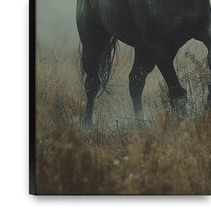 Dieses bezaubernde Werk fängt den Zauber eines Wintermorgens in der friesischen Landschaft ein, an dem zwei majestätische Friesenpferde spielerisch miteinander herumtollen. Der Nebel hängt wie eine weiche Decke über der Szene, während Tautropfen in den üppigen Mähnen der Pferde glitzern, wie stumme Zeugen des frühen Morgens.