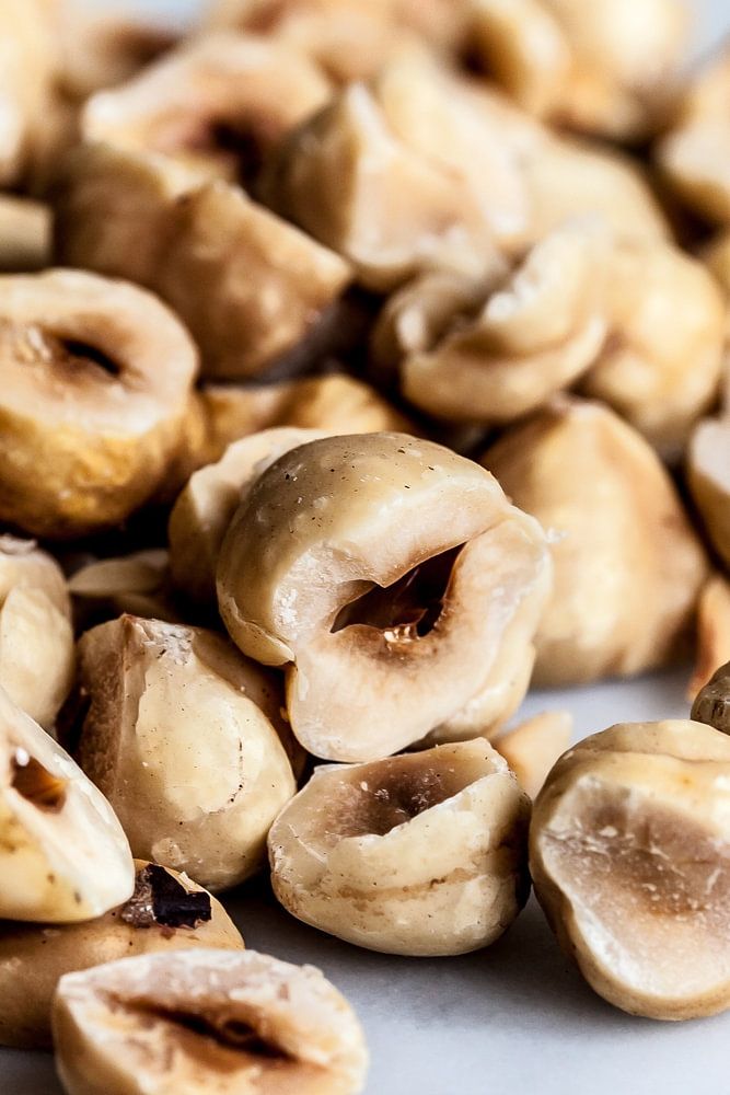 Frische, leicht geröstete Haselnüsse auf einem Marmorsockel.
