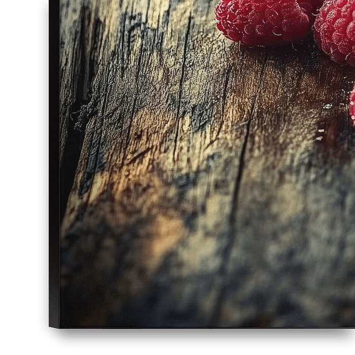 Saftige, rote Himbeeren liegen verlockend auf einer rustikalen Holzoberfläche, deren Struktur eine natürliche Wärme ausstrahlt. Die Frische der Früchte harmoniert perfekt mit der organischen Textur des Holzes und schafft ein einladendes Ambiente. Ideal für die Küche, wo sie eine appetitliche Note und inspirierende Atmosphäre verleihen.