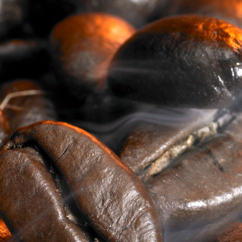 Detailaufnahme von frisch gerösteten, dampfenden Kafeebohnen