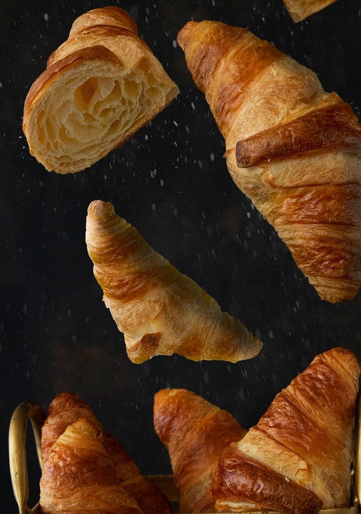 Im dunklen Hintergrund ist eine Sammlung von Croissants zu sehen, die in den Korb fallen. Mit dieser Komposition wollte ich die luftig-frische Komposition der Croissants hervorheben.