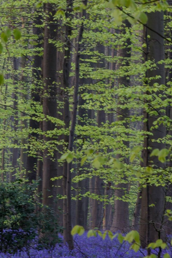 Im Frühjahr blühen die wilden Hyazinthen im Hallerbos, und mit dem Austreiben der frischgrünen Blätter der Buchen und der aufgehenden Morgensonne herrscht eine heitere Atmosphäre im Wald, in dem das Licht zwischen den Bäumen wunderschön auf die violettfarbenen wilden Hyazinthen fällt.