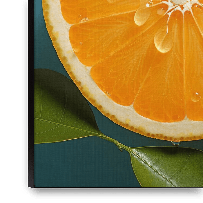 Frische, halbierte Orangen vor blauem Hintergrund. Der Farbkontrast zwischen dem Zweig, der Orange und dem Hintergrund macht dieses Werk zu einem frischen und fröhlichen Werk, das jeden Raum aufhellen wird.