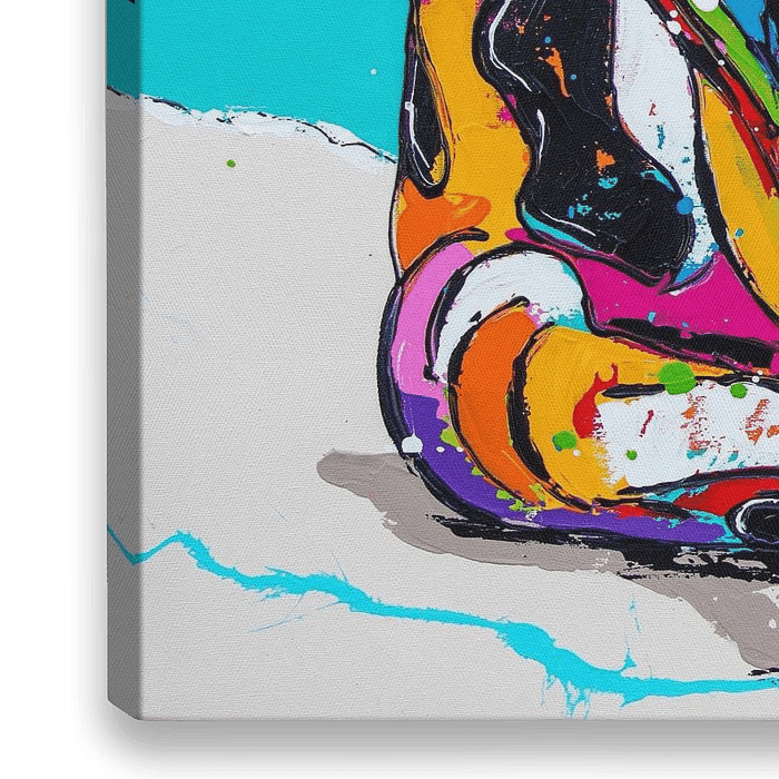 Entdecken Sie das pure Glück in der Kunst, während eine glückliche Kuh mit diesem farbenfrohen Gemälde einen Cocktail am Strand genießt. Lassen Sie sich von dem skurrilen Charme und den leuchtenden Farben zum Lächeln bringen.