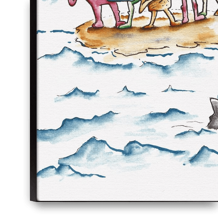 Lustiger Druck mit bunten Kritzeleien. Diese lustigen Figuren sind auf einer kleinen Insel gestrandet. Während der eine den Spaß an der Sache sieht, gerät der andere in Panik. Schöne Illustration für ein Kinderzimmer. Dieses Bild ist mit Aquarellfarben gemalt. Dies sorgt für schöne Farbverläufe bei den verschiedenen Männern.