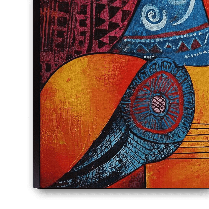 Fröhliche Vögel | Buntes Vogel-Gitarren-Duo - Dieses farbenfrohe Gemälde zeigt zwei fröhliche Vögel, die Gitarre spielen, mit lebhaften Mustern und einem verspielten Look, der die Modernität der Kunst unterstreicht.