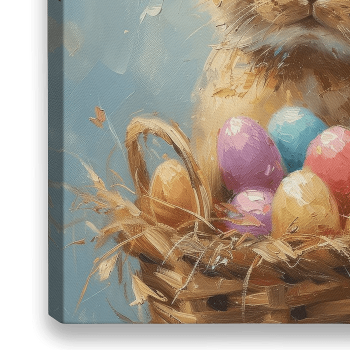 Fröhlicher und süßer Osterhase mit Ostereiern in Pastellfarben.