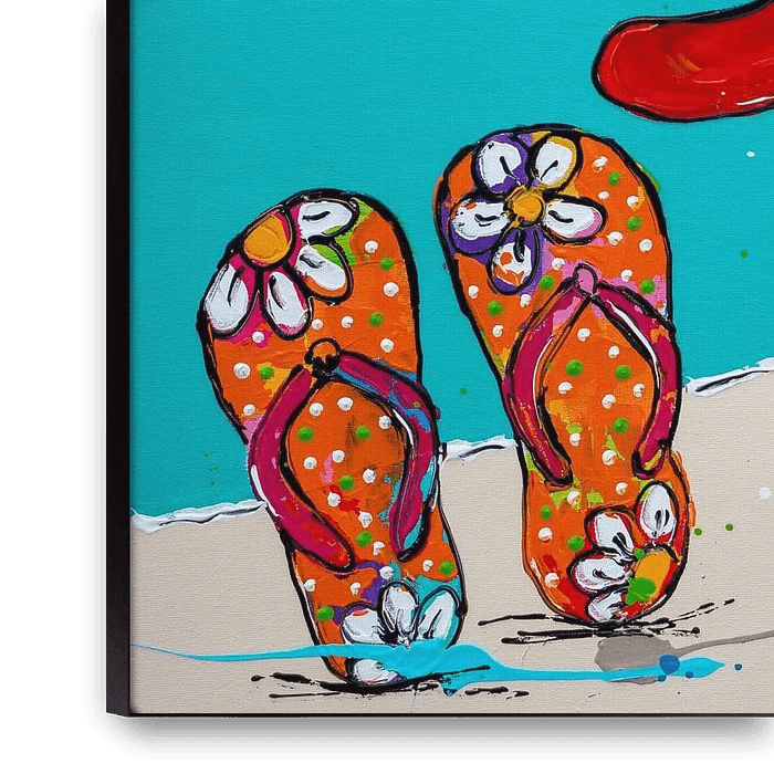 Die Künstlerin Renate Rolefes hat ein farbenfrohes Gemälde mit Acrylfarbe gemalt, das ein glückliches Huhn mit Flip-Flops am Strand zeigt (80 x 60).